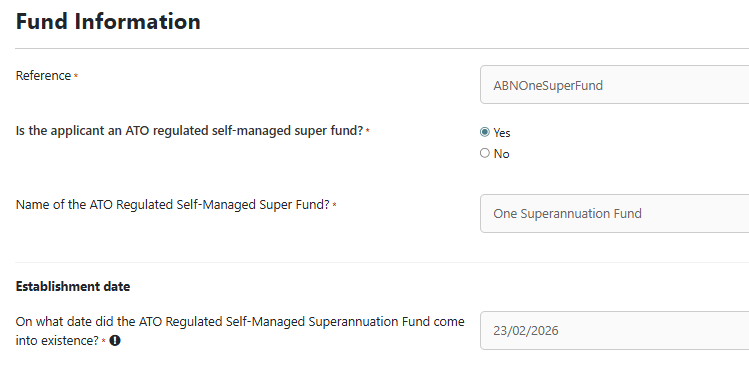 4. Enter the 'Fund Information'. This includes the Reference (your internal created reference), a question is the applicant an ATO regulated self-managed super fund, what is the name of the ATO Regulated Self-Managed Super Fund name and the Establishment date.