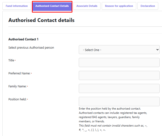 NOTE: Once you have entered your Authorised Contact details into the system, the system will retain your details, for any future ABN/TFN requests. The next ABN/TFN registration will allow you to simply click the dropdown option to select your name, a real time saver.