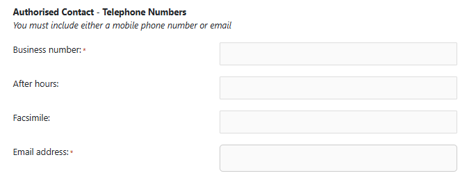 12. Enter the 'Authorised Contact - Telephone Numbers' details.