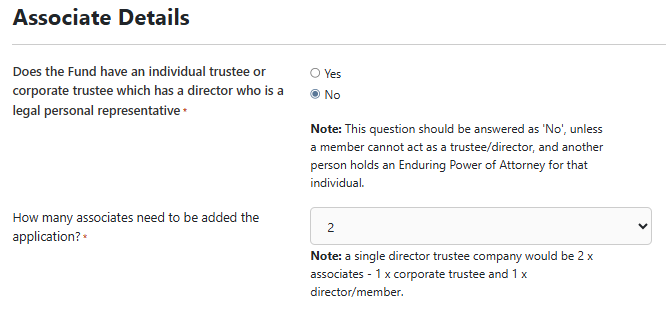 15. Complete all the 'Associate Details' responses. Note that the question relating to the Fund's director who is a legal personal representative should be answered as 'No'.