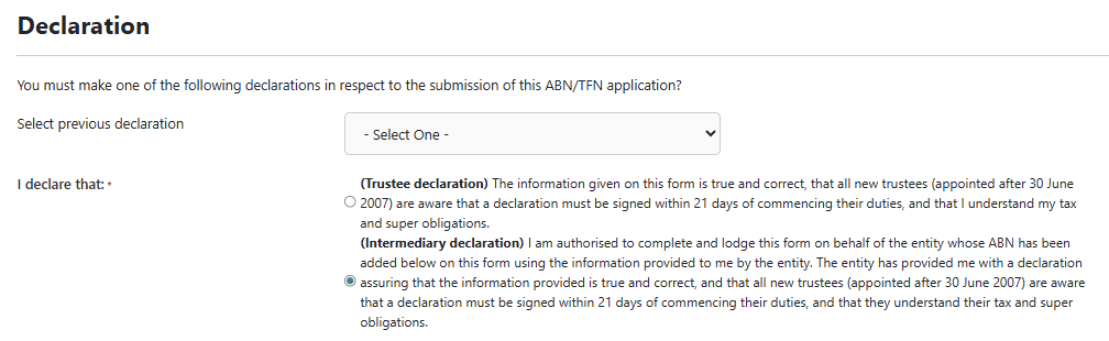 25. Select the option of either a 'Trustee or Intermediary declaration'.