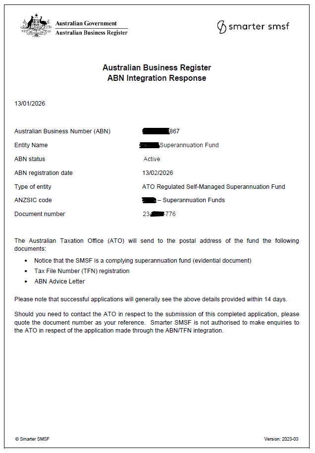 The ATO will forward the confirmation of a TFN in a separate notification. This process saves you significant time in the application process, an alternative to using the Australian Business Registry (ABR) website. The benefit of the data used in the New SMSF document is used to populate the fields for ABN/TFN form.