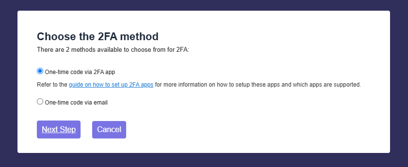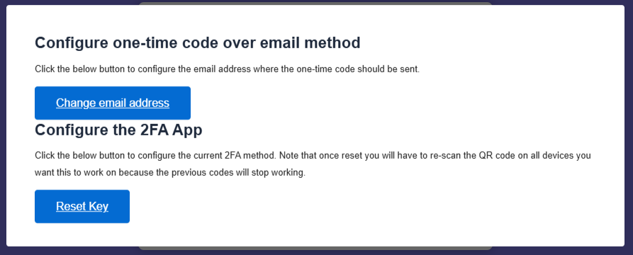 You have the ability to reset your 2FA settings from this 'sites' page as well, including switching between use an authenticator app and a OTP via email.