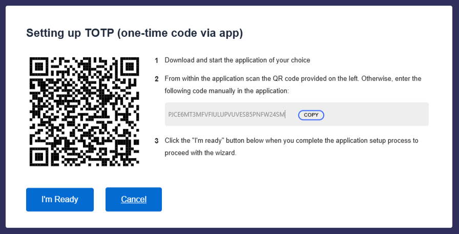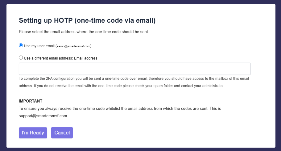 Setting up via email will allow you to use your login email or alternatively choose a different email address. Select 'I'm ready' when you're done.