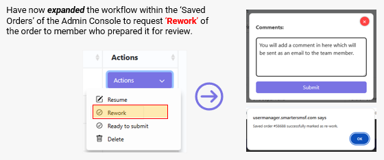 The Saved Orders workflow has been expanded to include a Rework function. Reviewers can now formally request changes on a saved order and include comments explaining what needs to be amended.