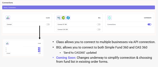 Integration capabilities continue to expand across Class, BGL and SuperMate. Users can now connect Class to multiple businesses via API, and BGL connections support both Simple Fund 360 and CAS 360. The “Send to CAS360” function has also been updated.