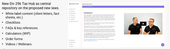 A new Division 296 Tax Hub will launch mid-February 2026 as a central resource for advisers navigating the proposed changes. The hub will include white-labelled client materials, checklists, FAQs, calculators (work in progress), order forms and educational videos and webinars.