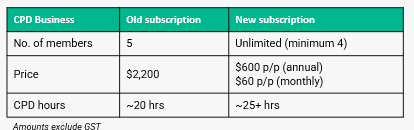 Updates have been made to the CPD Business subscription model. Existing subscriptions will remain unchanged until 30 June 2026, after which they will transition to the new pricing and inclusions, offering increased CPD hours and greater flexibility for growing teams.